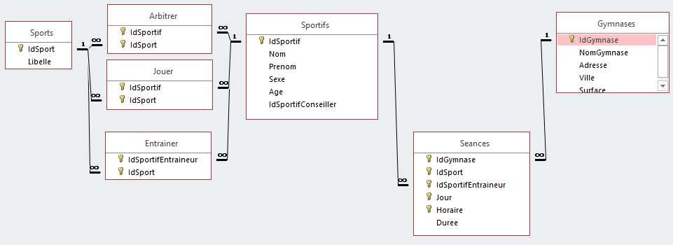Dans la table Seances et dans la table Entrainer, l'identifiant des sportifs entraîneurs est nommé IdSportifEntraineur. Et il faut faire attention aux minuscules/majuscules dans les différents champs de type texte. Si un sportif a un conseiller éventuellement, l'identifiant de celui-ci est indiqué dans IdSportifConseiller (NULL sinon).