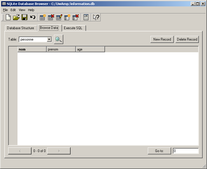 Pour créer une nouvelle base de données il faut cliquer sur New Database dans le menu File de UwAmp puis indiquer le nom d'un nouveau fichier. On peut ensuite créer les tables et ajouter des enregistrements en lançant des requêtes SQL dans l'onglet Execute SQL.