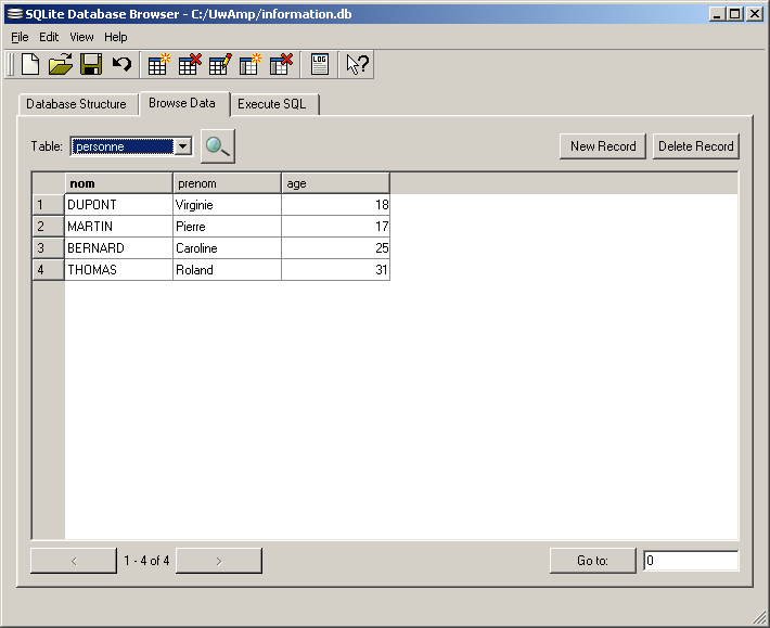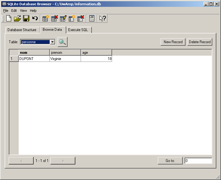 La table personne contient maintenant 1 enregistrement. Pour voir le contenu de la table il faut retourner dans l'onglet Browse Data: