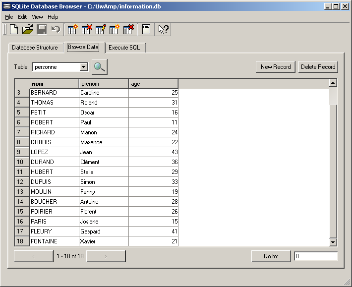 La table personne contiendra 18 enregistrements sur les 18 personnes suivantes en précisant leur nom, leur prénom et leur age :