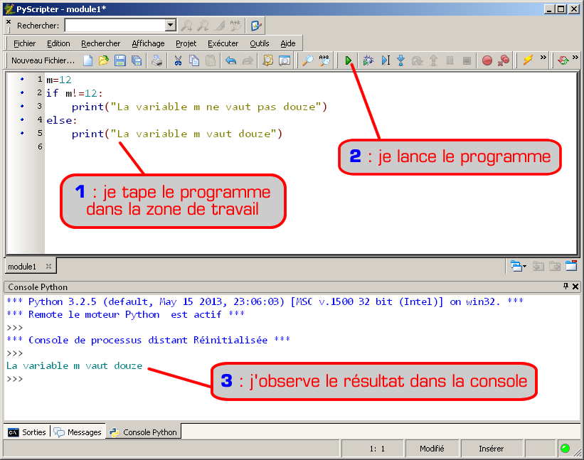 Effectuer un test sur une variable Voici rapidement les différentes syntaxes de la structure conditionnelle if en Python. Un test simple : >>> m=12 Un test complet : >>> m=12 Jusqu'à présent toutes les lignes de code sont tapées dans la console de Python (symbolisée par les 3 chevrons fermant >>> sur le programme ci-dessus). Mais lorsqu'il y a plusieurs lignes de code dans un programme il est plus pratique de les taper dans la zone de travail de Python. Par exemple le programme ci-dessus contient 5 lignes de code. Pour le tester il faut réaliser les 3 étapes suivantes :