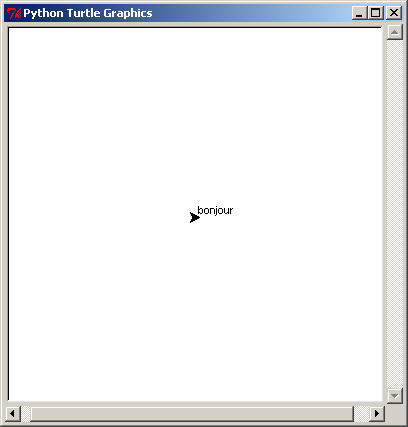 La fonction write permet d'écrire du texte dans la fenêtre de la tortue. Exemple : write('Bonjour'). Voici le résultat obtenu :