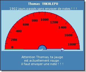 ■ le critère de travail : il faut envoyer au moins une note rouge pour chaque devoir ■ le critère de niveau : la moyenne des notes vertes envoyées détermine la base de la note bonus ■ le critère de quantité : il faut envoyer plus de 1000 questions vertes par semestre ■ le critère de continuité : il ne faut jamais laisser 15 jours d'inactivité sans envoi de notes ■ le critère de régularité : il faut maintenir une cadence de travail supérieure à 200 questions par semaine ■ le critère de répartition : il faut éliminer tous les thèmes oubliés et tous les thèmes incomplets ■ le critère de rapidité : il faut éviter d'envoyer la première note rouge d'un devoir parmi les derniers |