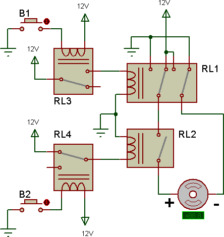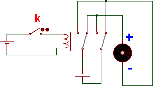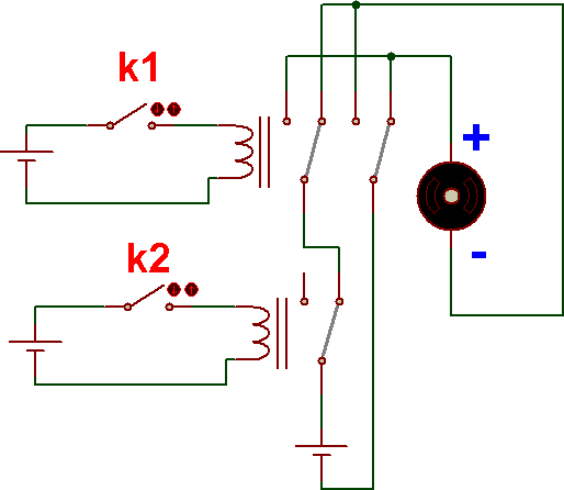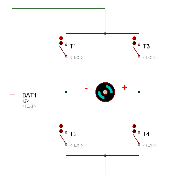 Enfin, avec 4 interrupteurs, il est possible d'alimenter un moteur grâce à un "pont en H" :